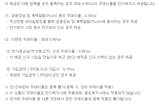 - 우대 금리 조건 (아래 조건 만족 시 0.55% 우대이율)